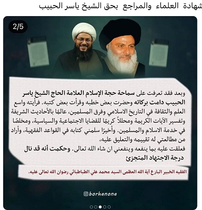 ان “ياسر الحبيب” هو أحد اتباع جماعة الشيرازي المتطرفة وهو في الحقيقة صهر الشيرازي، والذي يدير قناة فدك، ويتعرض من خلالها باستمرار لرموز أهل السنة، والتطاول على زوجات النبي صلى الله عليه وسلم والصحابة.